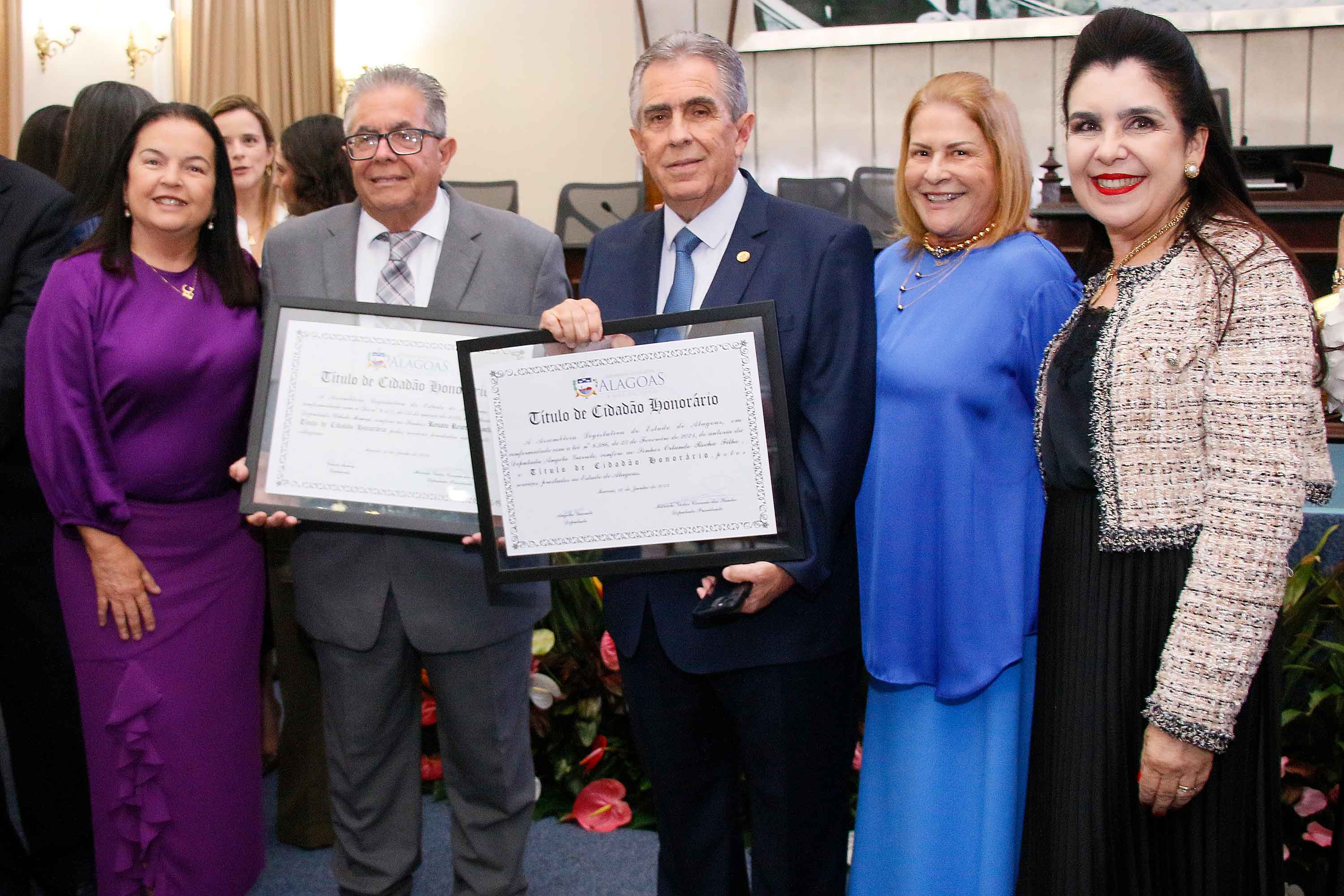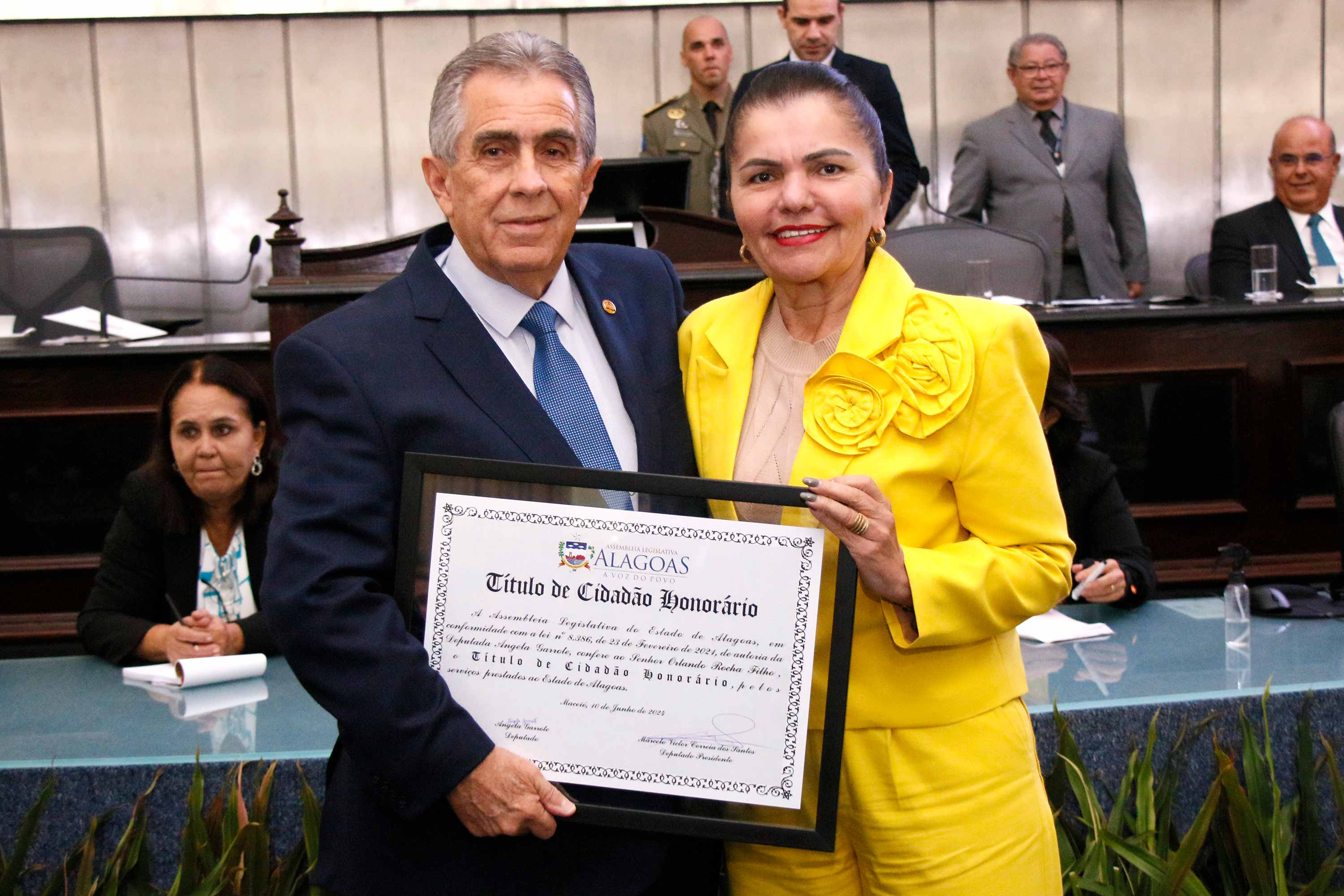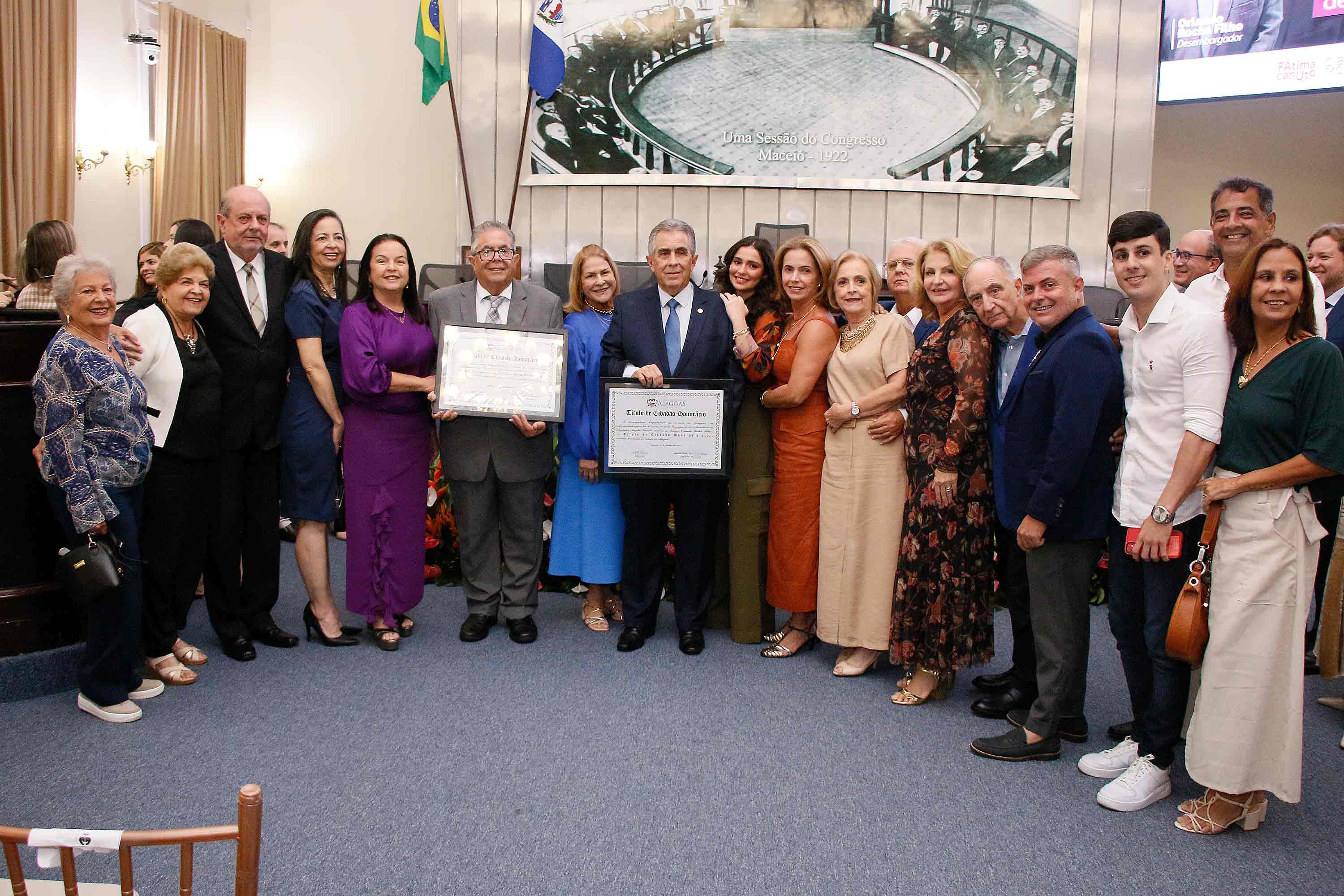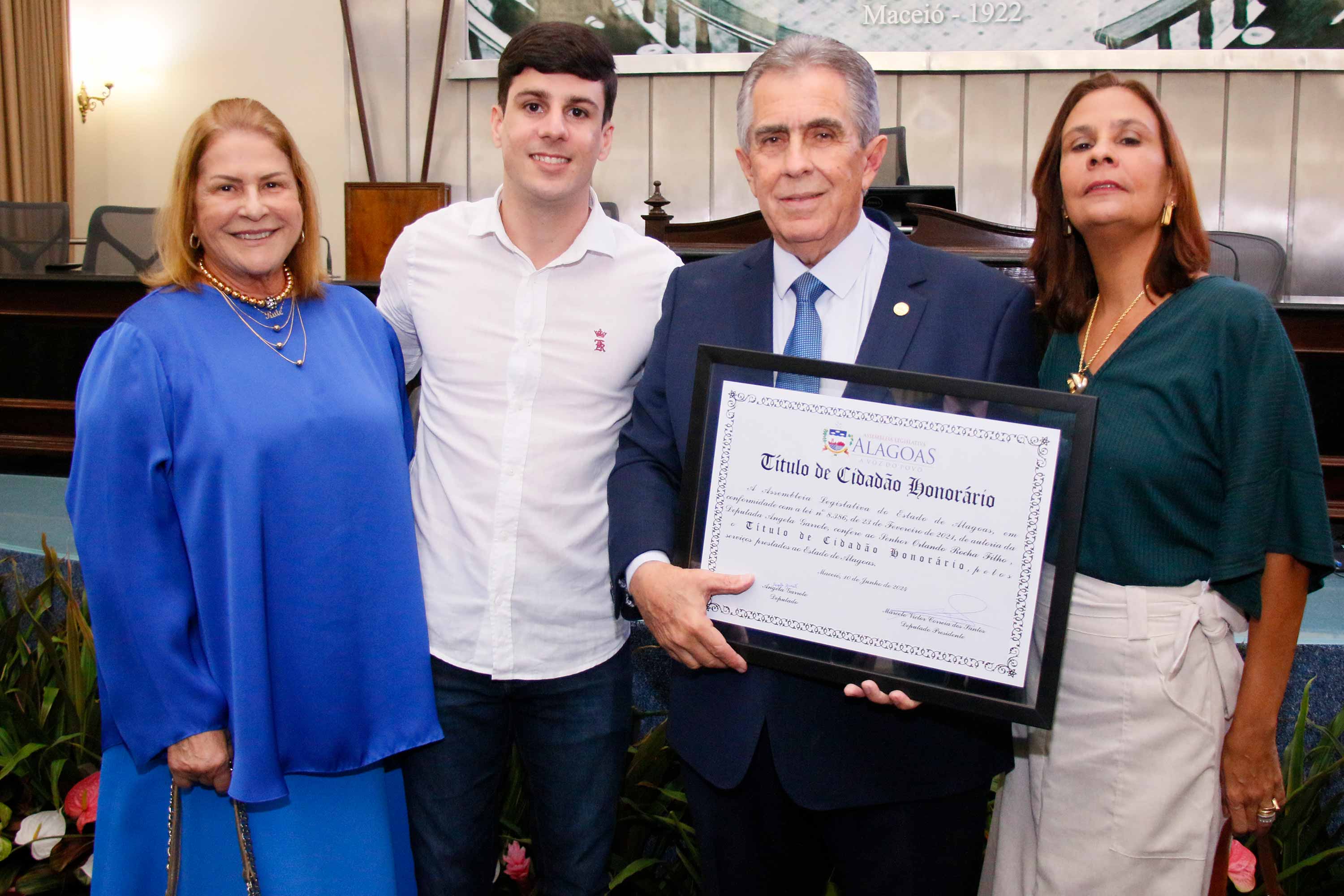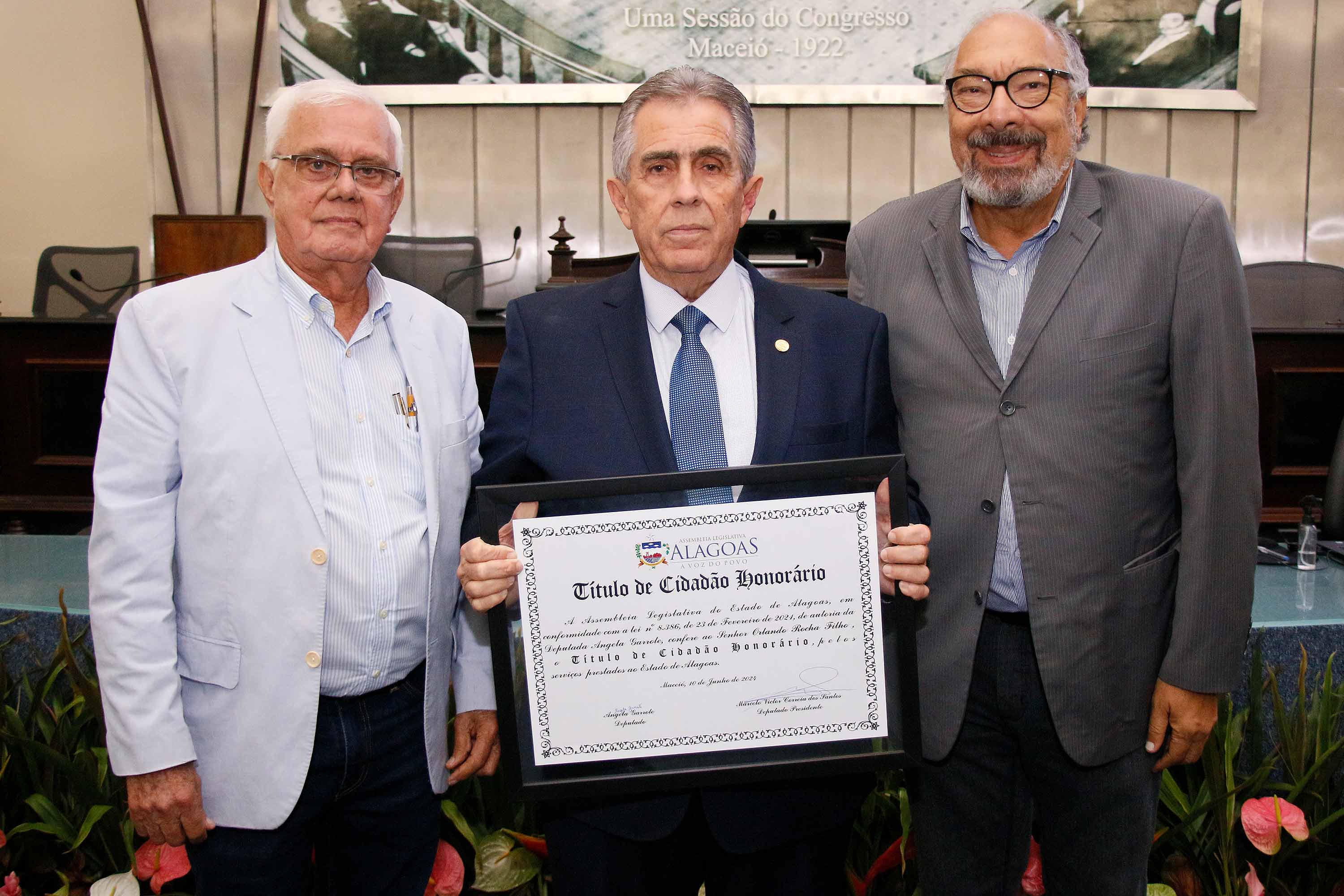 O desembargador Orlando Rocha Filho, vice-presidente do Tribunal de Justiça de Alagoas (TJAL), recebeu o título de cidadão honorário de Alagoas, nesta segunda (10), na Assembleia Legislativa do estado (ALE). Na ocasião, seu irmão, médico Renato Rezende Rocha, também foi homenageado.