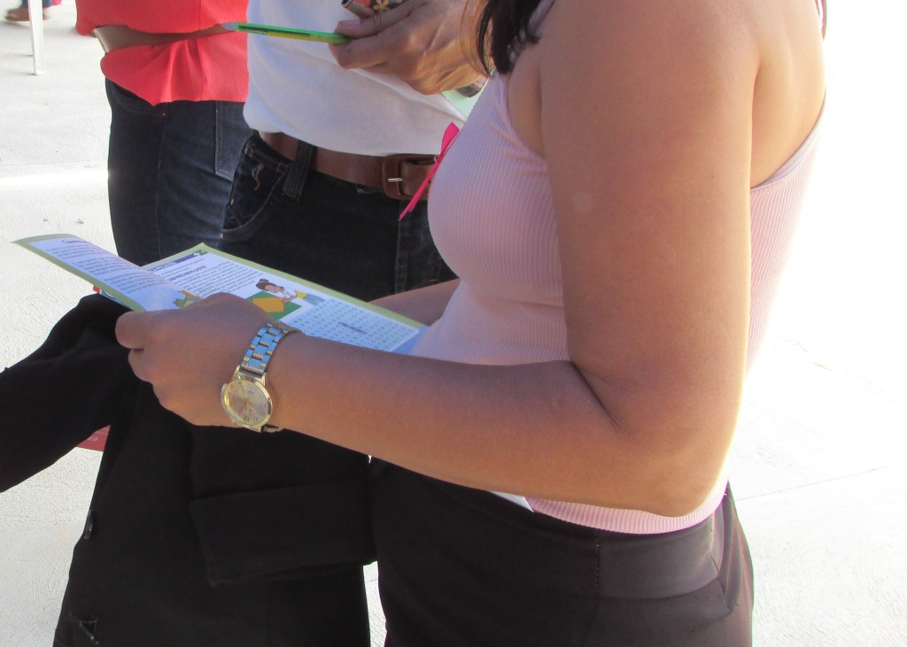 As funcionárias da Esmal Luzia Rodrigues e Dilma Silva, que atuam no PCJE, foram as responsáveis por orientar as pessoas que visitaram o estande do Programa, em sua maioria servidores públicos e estudantes, sobre como ele funciona. Elas entregaram panfletos, camisetas, bonés e exemplares impressos do Estatuto da Criança e do Adolescente e da Lei Maria da Penha aos visitantes.