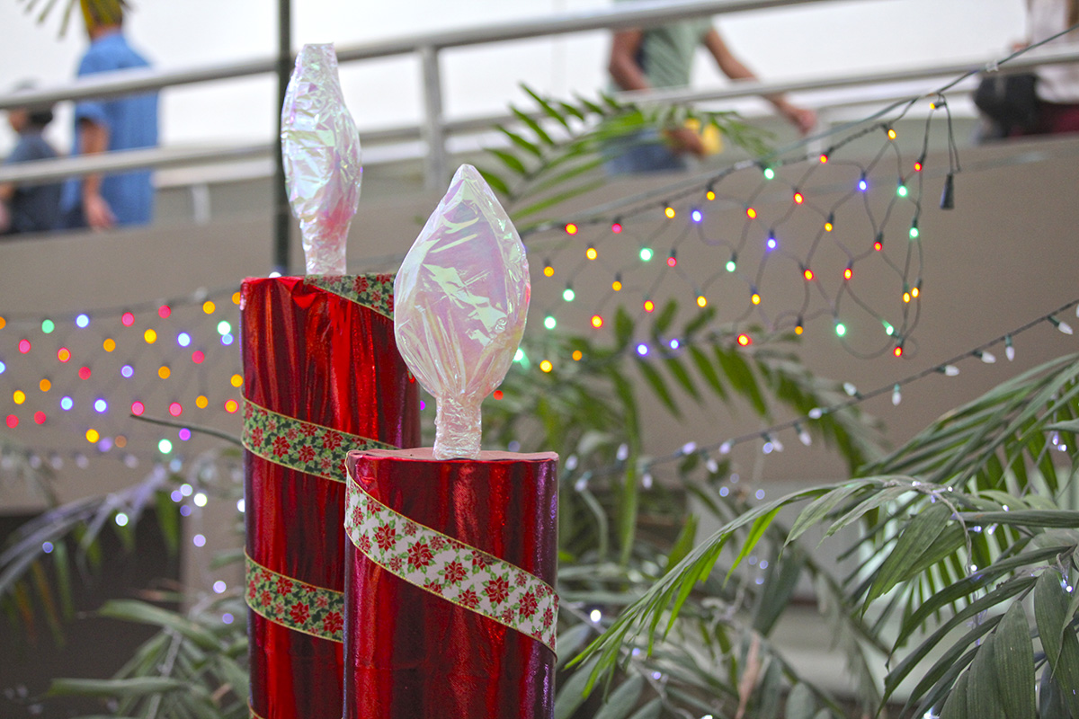 “Essa casa grande foi feita com caixas de ar-condicionado e as velas com lixeiras que estavam em desuso. Pegamos algumas garrafas, caixas, embalamos e tentamos fazer tudo com muito amor”, disse a diretora-geral do Fórum, Rita Maia Lemos Lyra.