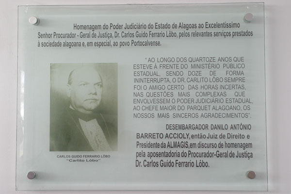 “Ao longo dos catorze anos que esteve à frente do Ministério Público Estadual, sendo doze de forma ininterrupta, o Dr. Carlito Lôbo sempre foi o amigo certo nas questões mais complexas que envolvessem o Poder Judiciário estadual. Ao chefe maior do Parquet alagoano, os nossos mais sinceros agradecimentos”, foram as palavras ditas pelo desembargador Danilo Antônio Barretto Accioly, então juiz de Direito e presidente da Associação Alagoana de Magistrados (Almagis), em discurso de homenagem pela aposentadoria do homenageado, que estão crivadas na placa em sua homenagem.