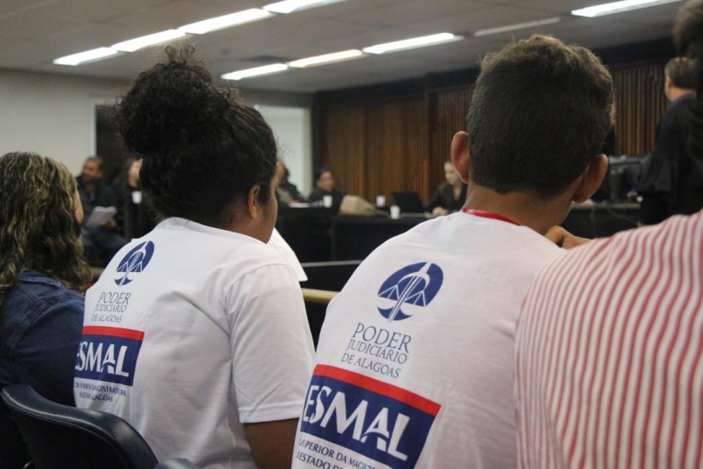 Nesta quarta-feira (16), dez alunos de escolas públicas de Maceió tiveram a oportunidade de acompanhar um julgamento presidido pela juíza Lorena Carla Sotto-Mayor, no 2º Tribunal do Júri, no Fórum da Capital, no Barro Duro. Os estudantes foram selecionados para participar da primeira edição do projeto ‘Jovem Juiz’, projeto do Programa Cidadania e Justiça na Escola (PCJE), da Escola Superior da Magistratura de Alagoas (Esmal).