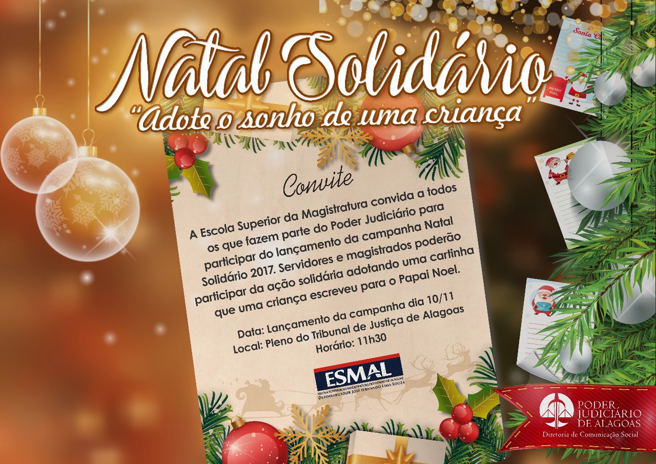 Com o tema “Adote o sonho de uma criança”, o Natal Solidário será lançado nesta sexta-feira (10), às 11h30, no Pleno do Tribunal de Justiça. A campanha é realizada pela Escola Superior da Magistratura de Alagoas (Esmal), por meio do Programa Cidadania e Justiça na Escola (PCJE), e contempla estudantes da rede pública de ensino.