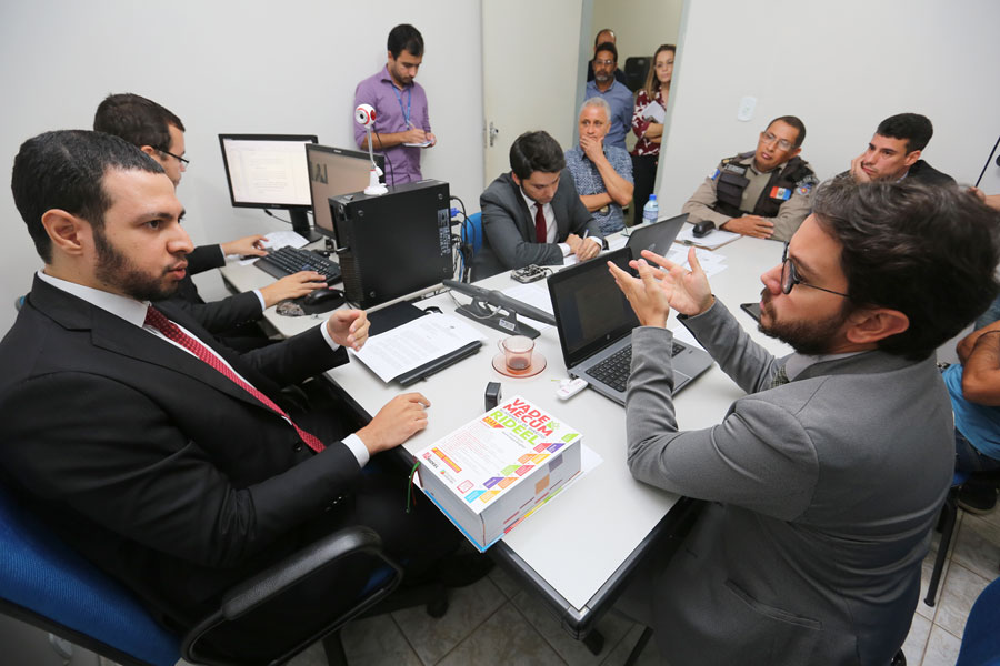 Juiz Eric Baracho ouve defensor público Manoel Correia, durante audiência em Joaquim Gomes. Fotos: Caio Loureiro.