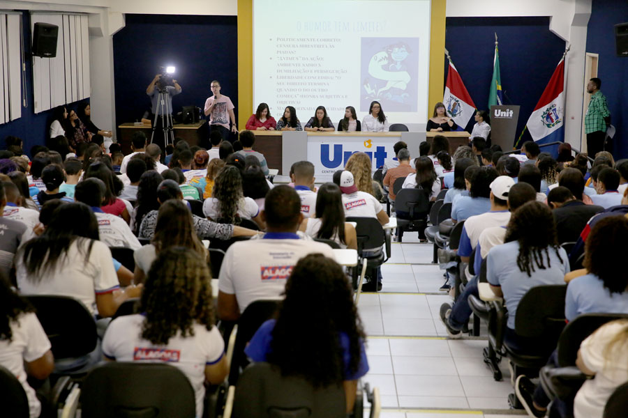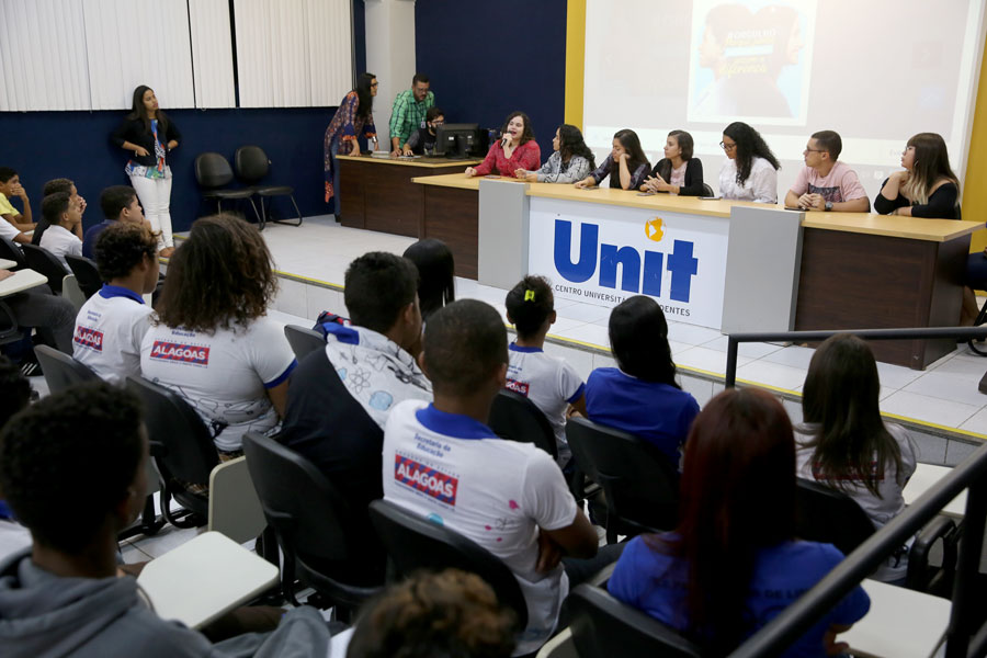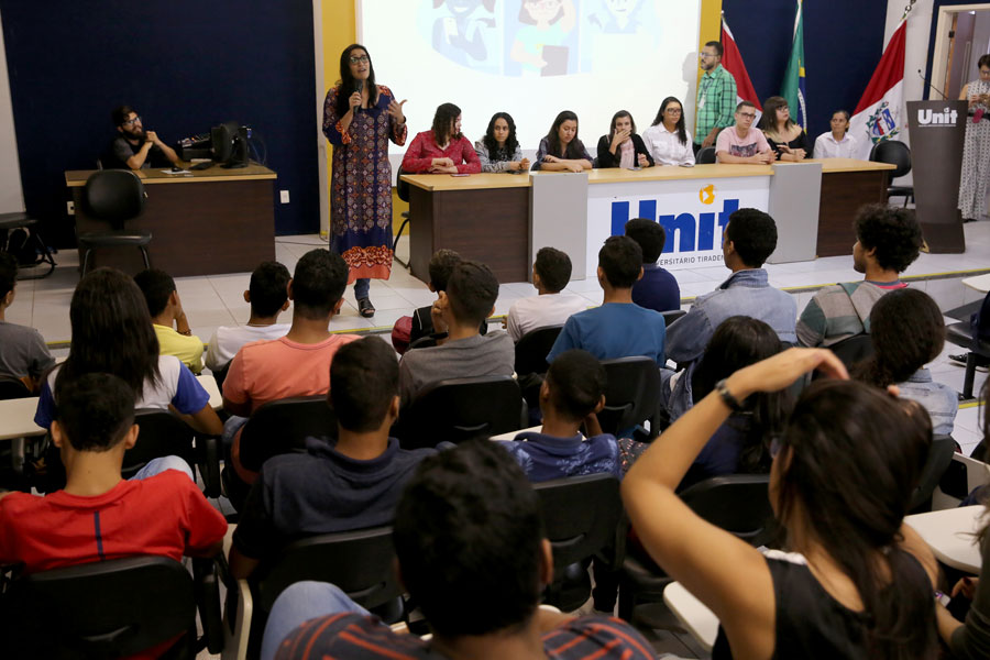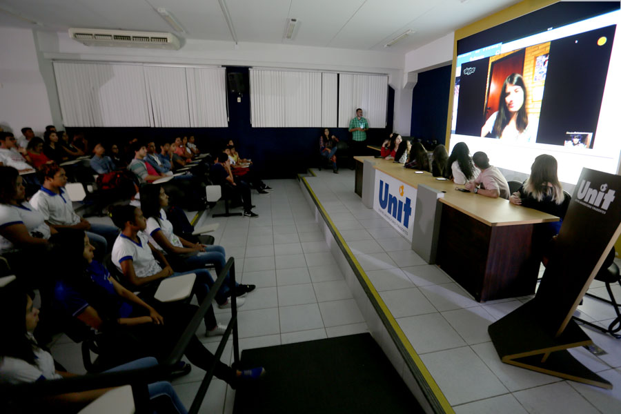 Na ocasião, os alunos participaram de um circuito de palestras proferidas por estudantes da Unit, que falaram sobre diversos assuntos como cyberbullyling, preconceito e fake news (notícias falsas).