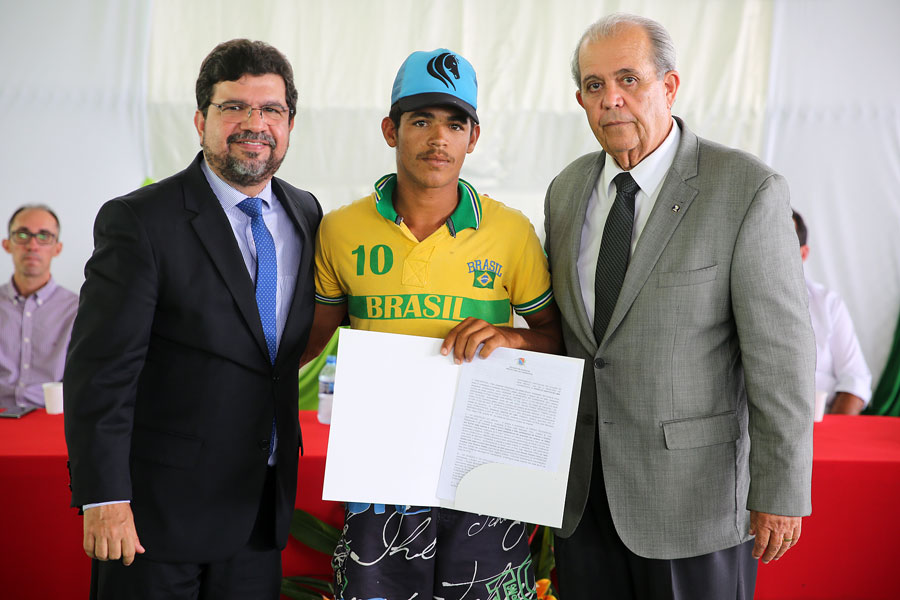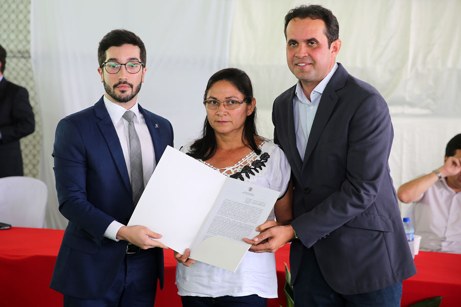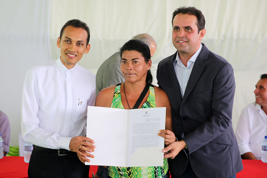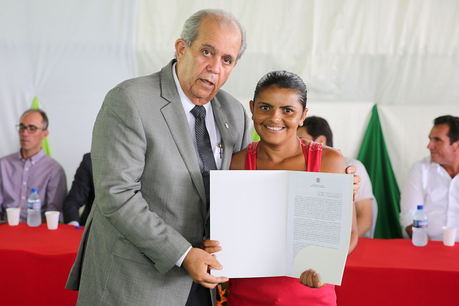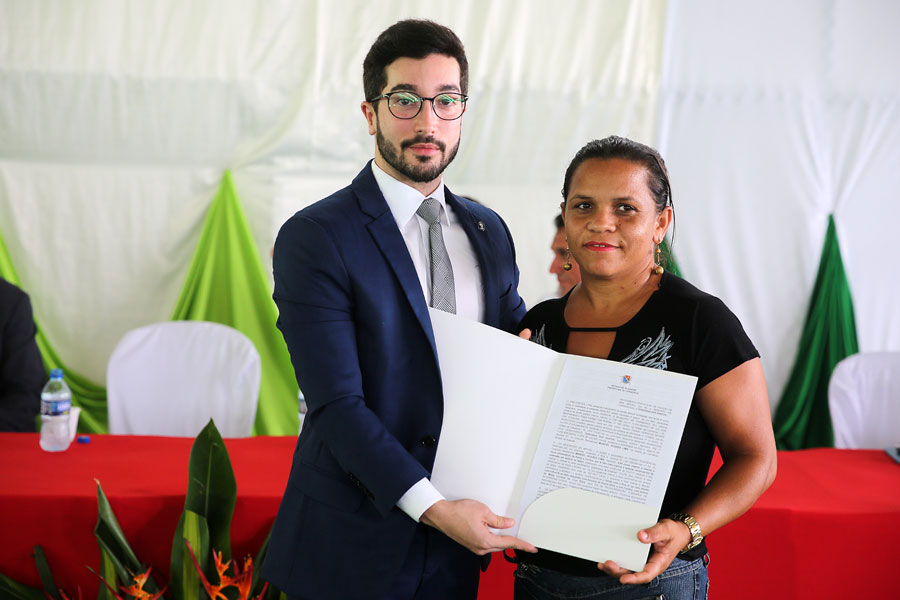 Moradora Rita dos Santos recebeu o título das mãos do desembargador Celyrio Adamastor e do prefeito Geraldo Filho. Foto: Caio Loureiro.