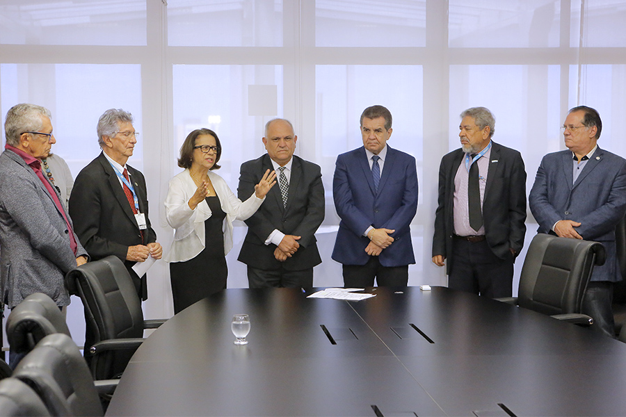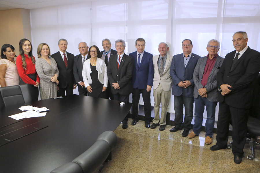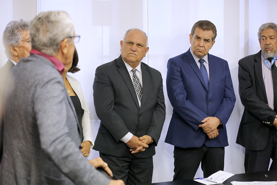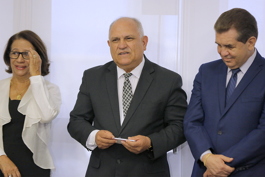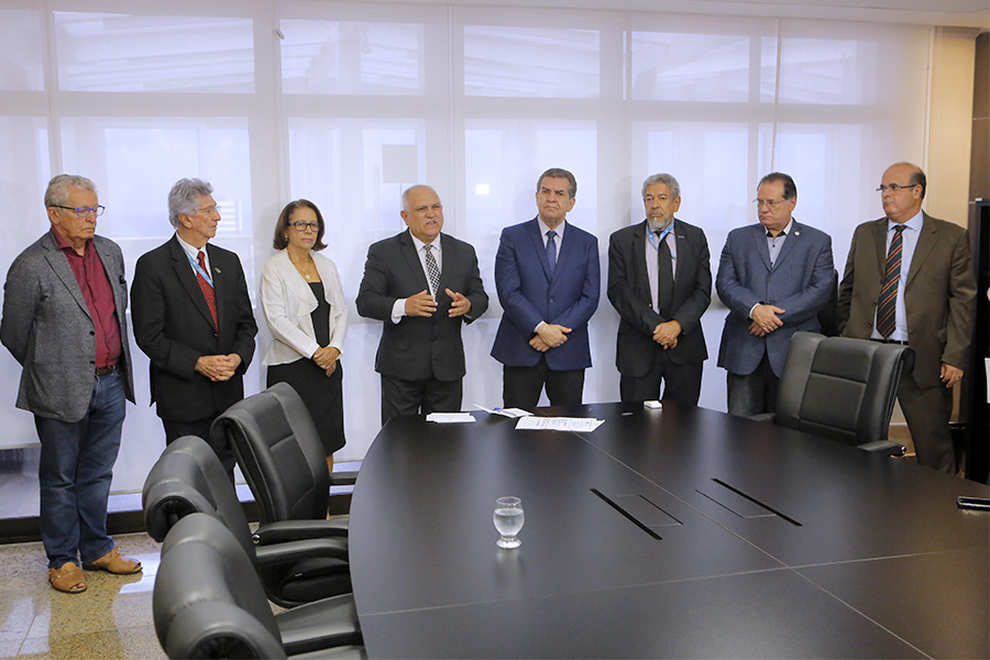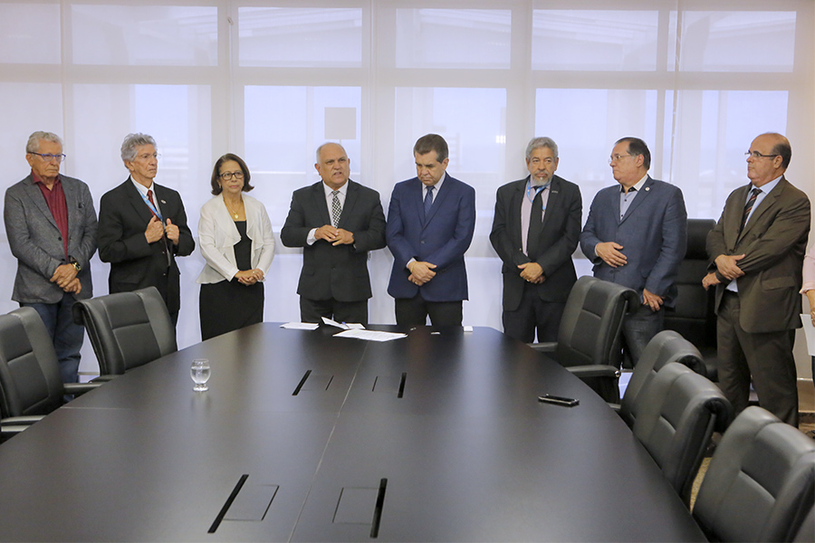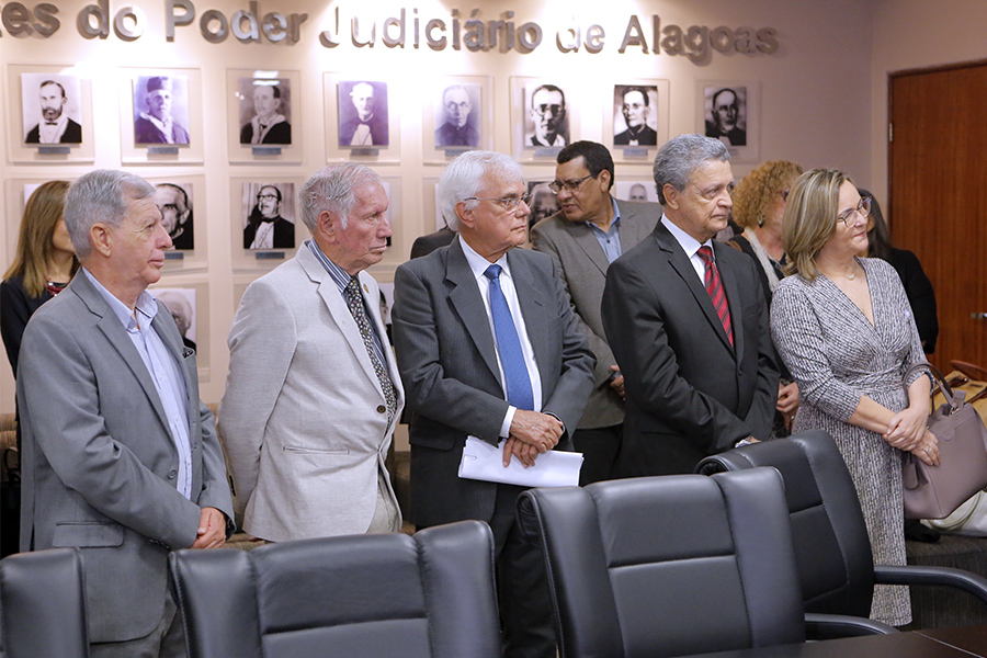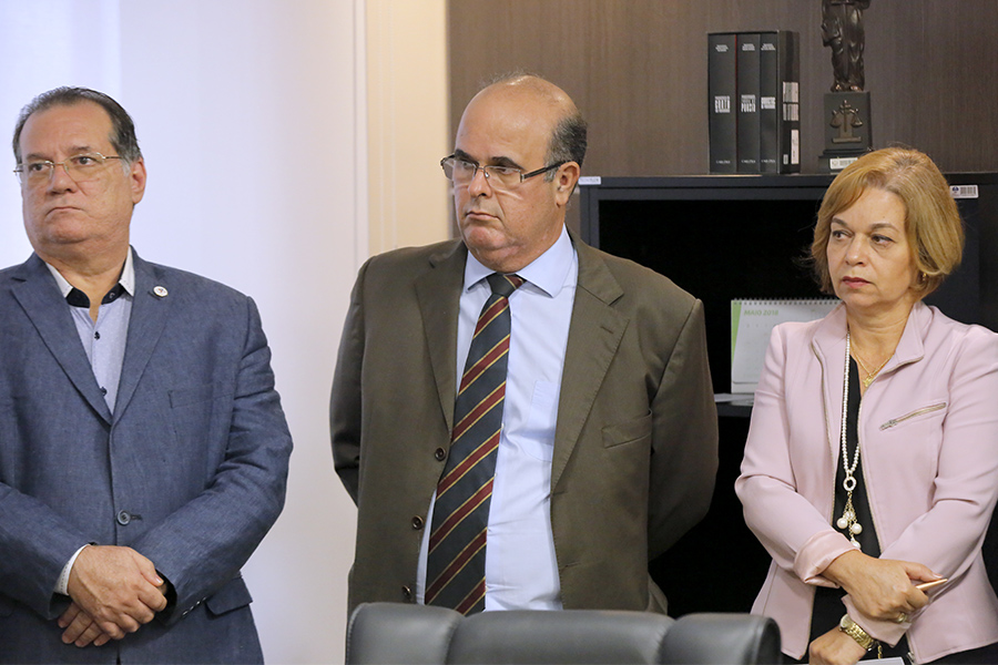 Os desembargadores Washington Luiz Damasceno Freitas e Fernando Tourinho de Omena Souza participaram da solenidade de assinatura, entre outras personalidades do Judiciário e do meio universitário.
