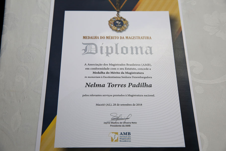 A Associação de Magistrados Brasileiros (AMB) e a Associação Alagoana de Magistrados (Almagis) prestaram homenagem póstuma à desembargadora Nelma Padilha, primeira juíza de Alagoas, com a entrega da medalha do Mérito da Magistratura à família da magistrada. A solenidade ocorreu na sede da Escola Superior da Magistratura de Alagoas (Esmal), nesta sexta-feira (28).