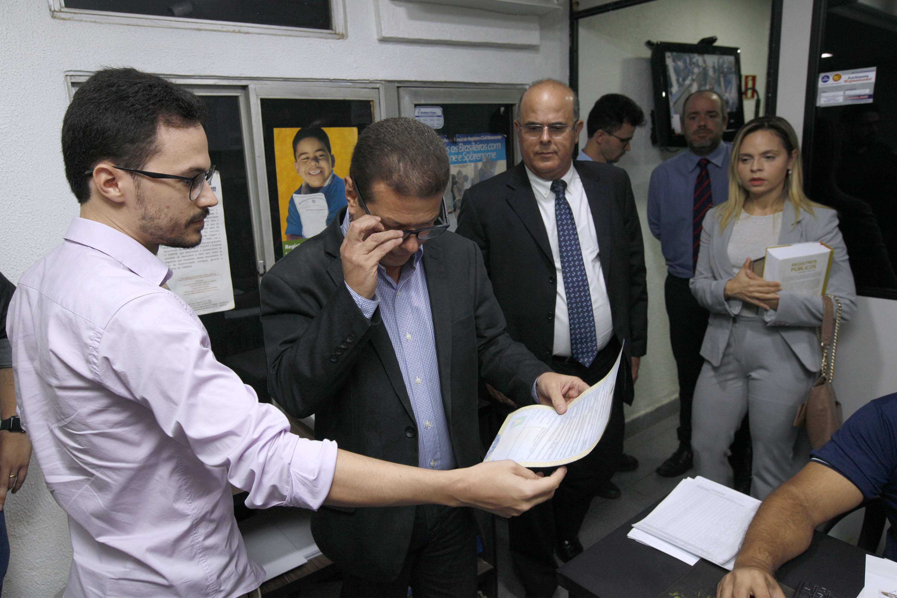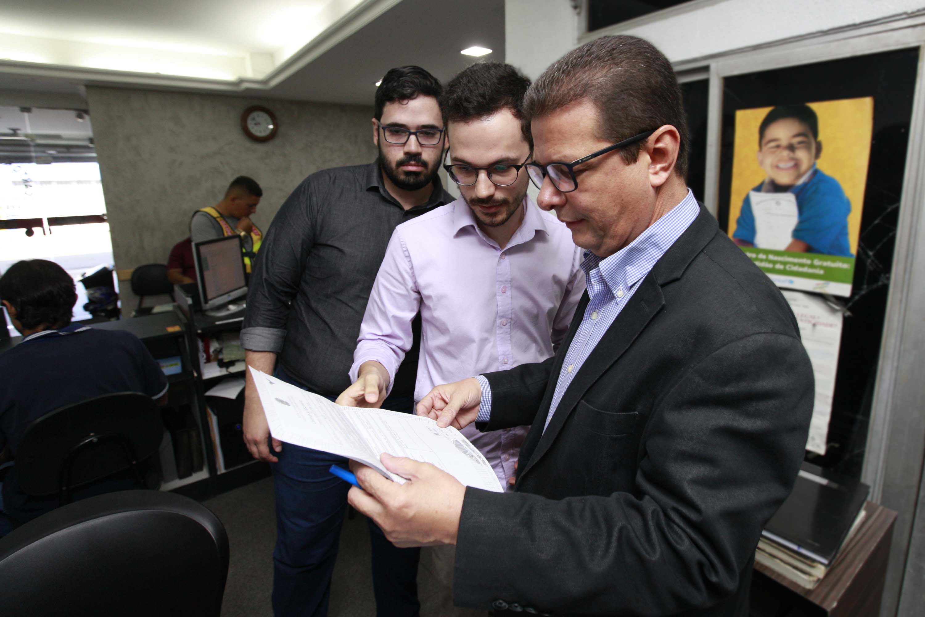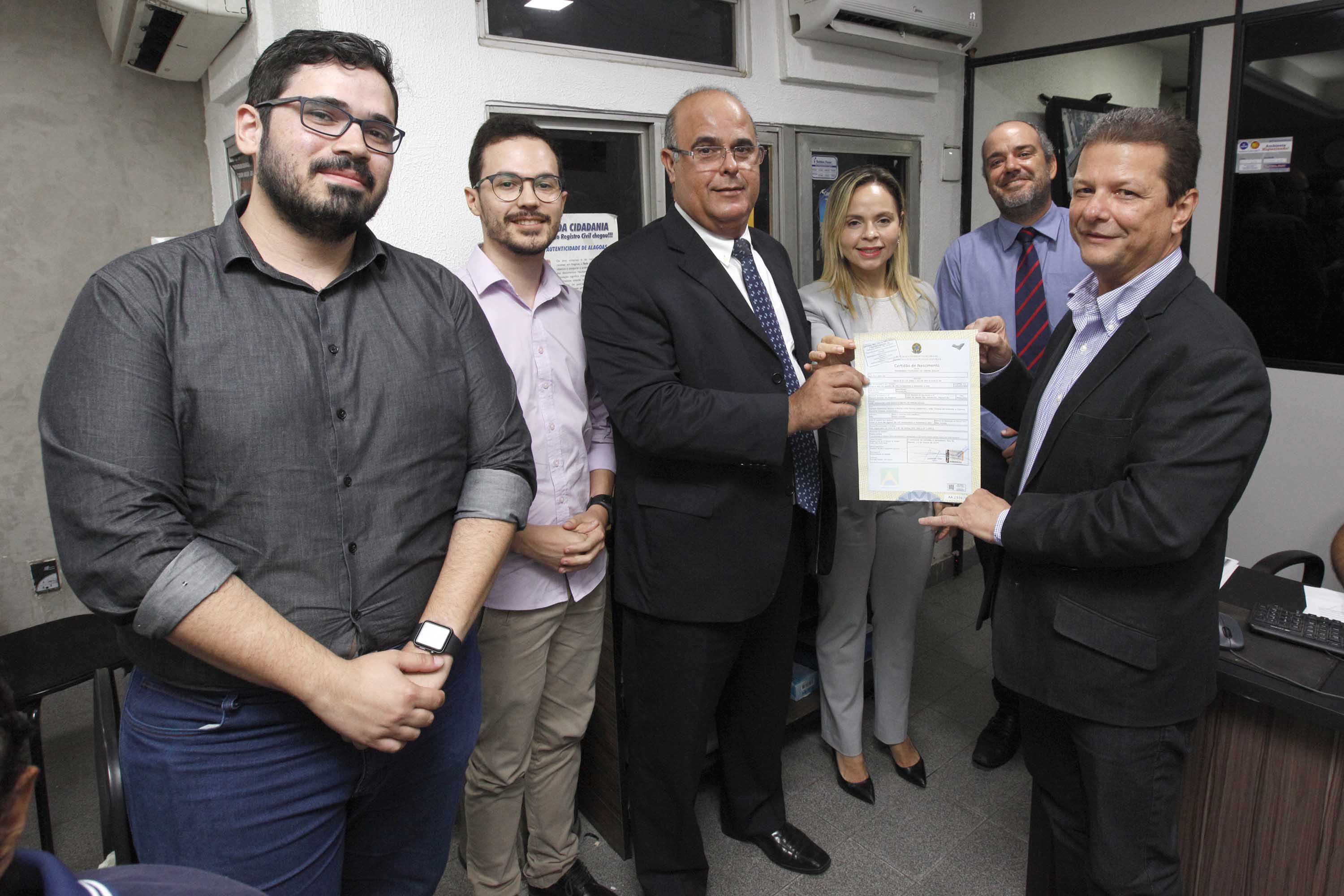 O corregedor-geral da Justiça, Fernando Tourinho, e a juíza Lorena Sotto-Mayor estiveram no cartório de Ofício de Registro Civil de Pessoas Naturais, na manhã desta quarta-feira (13), para dar prosseguimento à etapa de implantação do projeto-piloto do Selo Digital. Na oportunidade, a primeira certidão de nascimento foi emitida com o selo QR Code, cujas informações do ato podem ser consultadas através de smartphone.