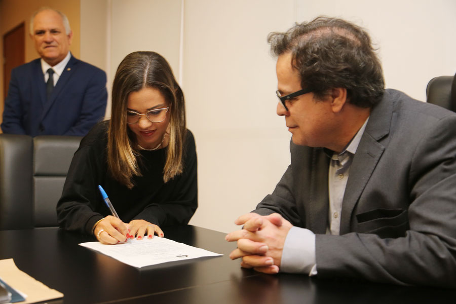 Tutmés Airan assina termo de posse da juíza Eliana Machado. Foto: Caio Loureiro.