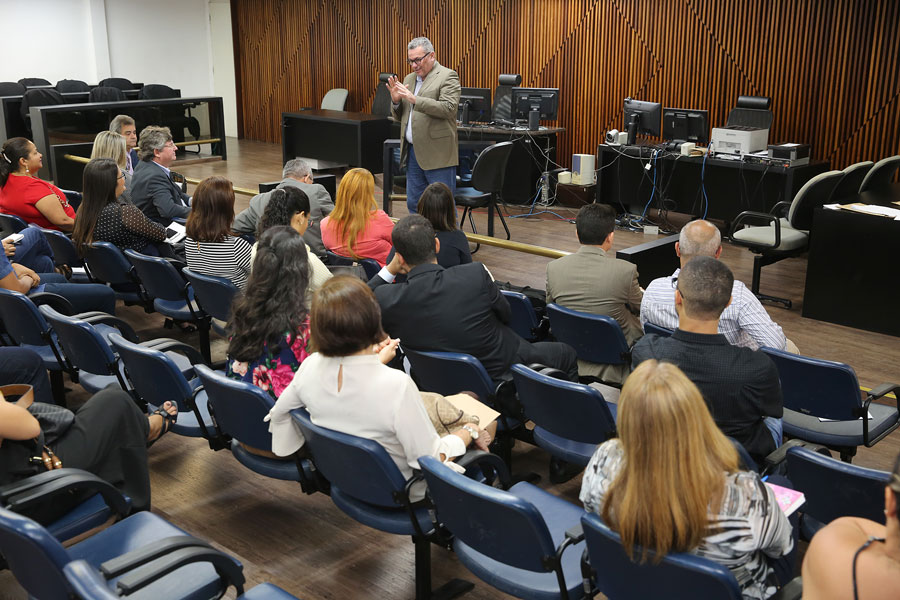 Desembargador Domingos Neto fala para juízes e servidores no Fórum da Capital. Foto: Caio Loureiro.