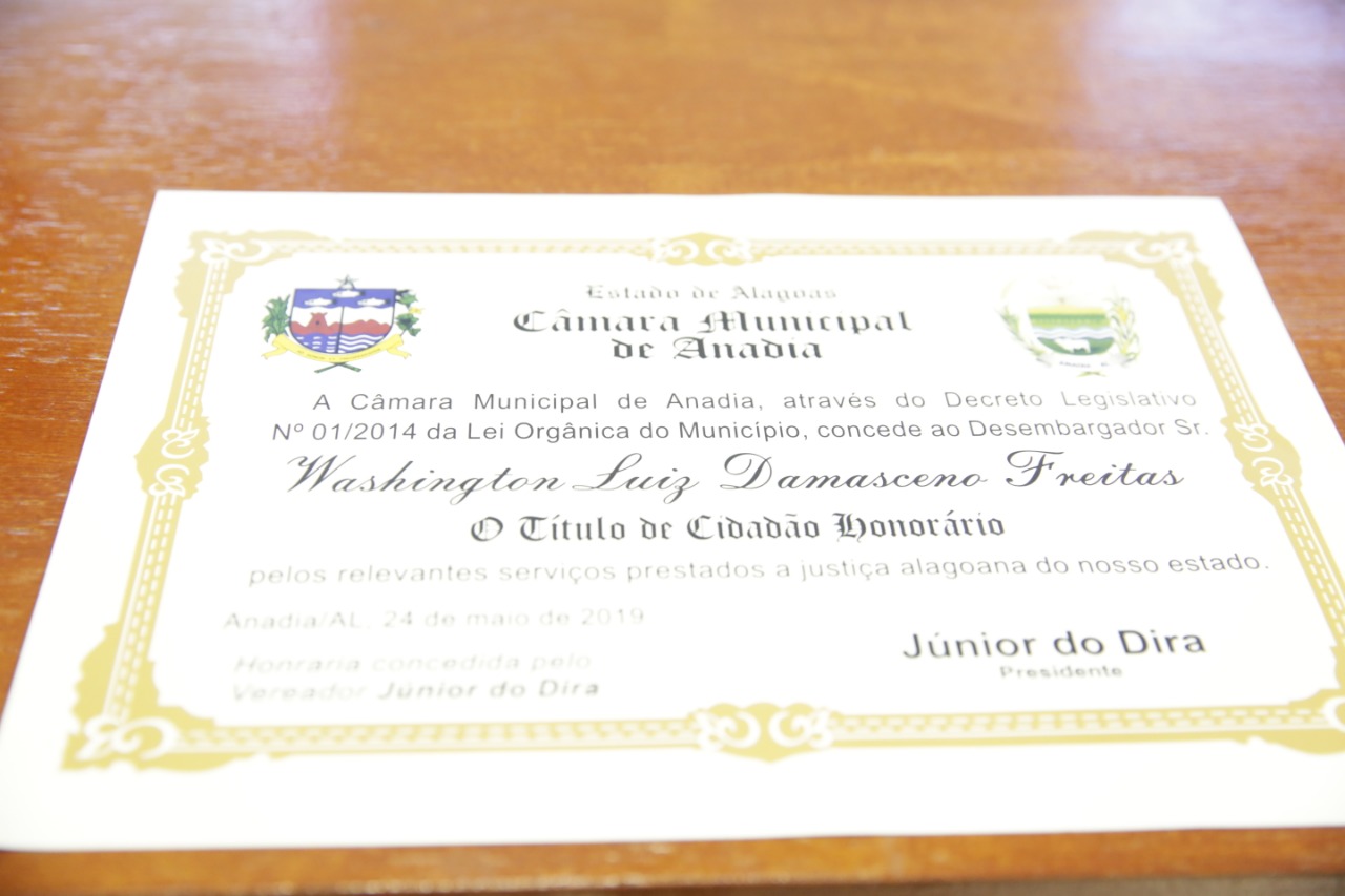 O desembargador Washington Luiz Damasceno Freitas, do Tribunal de Justiça de Alagoas (TJAL), recebeu nesta sexta-feira (24) o título de cidadão honorário de Anadia, pelo trabalho realizado no Judiciário estadual. A homenagem foi feita na Câmara de Vereadores.