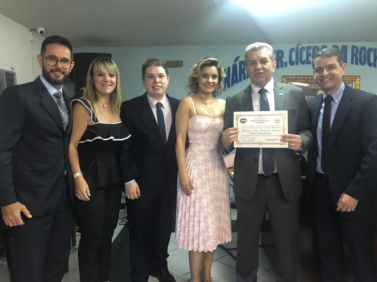 O título de cidadão honorário foi proposto pelo presidente da Câmara, Edirajar Falcão Pedrosa Júnior. "Washington Luiz já foi promotor de justiça, vereador, deputado e hoje presta importantes serviços no Judiciário. É uma homenagem a um grande homem", destacou o vereador.