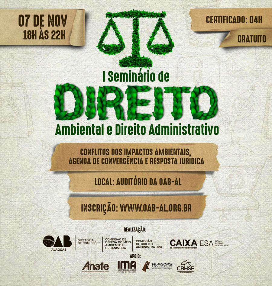 O seminário é gratuito, oferta 600 vagas e será realizado das 18h às 22h, no auditório da OAB/AL, em Jacarecica. Os participantes receberão certificado de 4 horas.