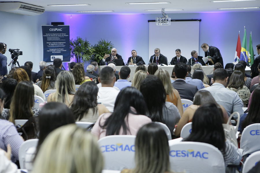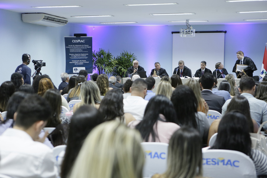 A Câmara Criminal do Tribunal de Justiça de Alagoas (TJAL) deu início, na noite desta quarta-feira (13), ao projeto “Aproximando a Justiça Criminal da Sociedade” com a realização de uma sessão itinerante no Centro Universitário Cesmac. Cerca de 250 alunos do curso de Direito assistem, no auditório e em sala ao lado com transmissão ao vivo, ao julgamento de 12 recursos criminais.