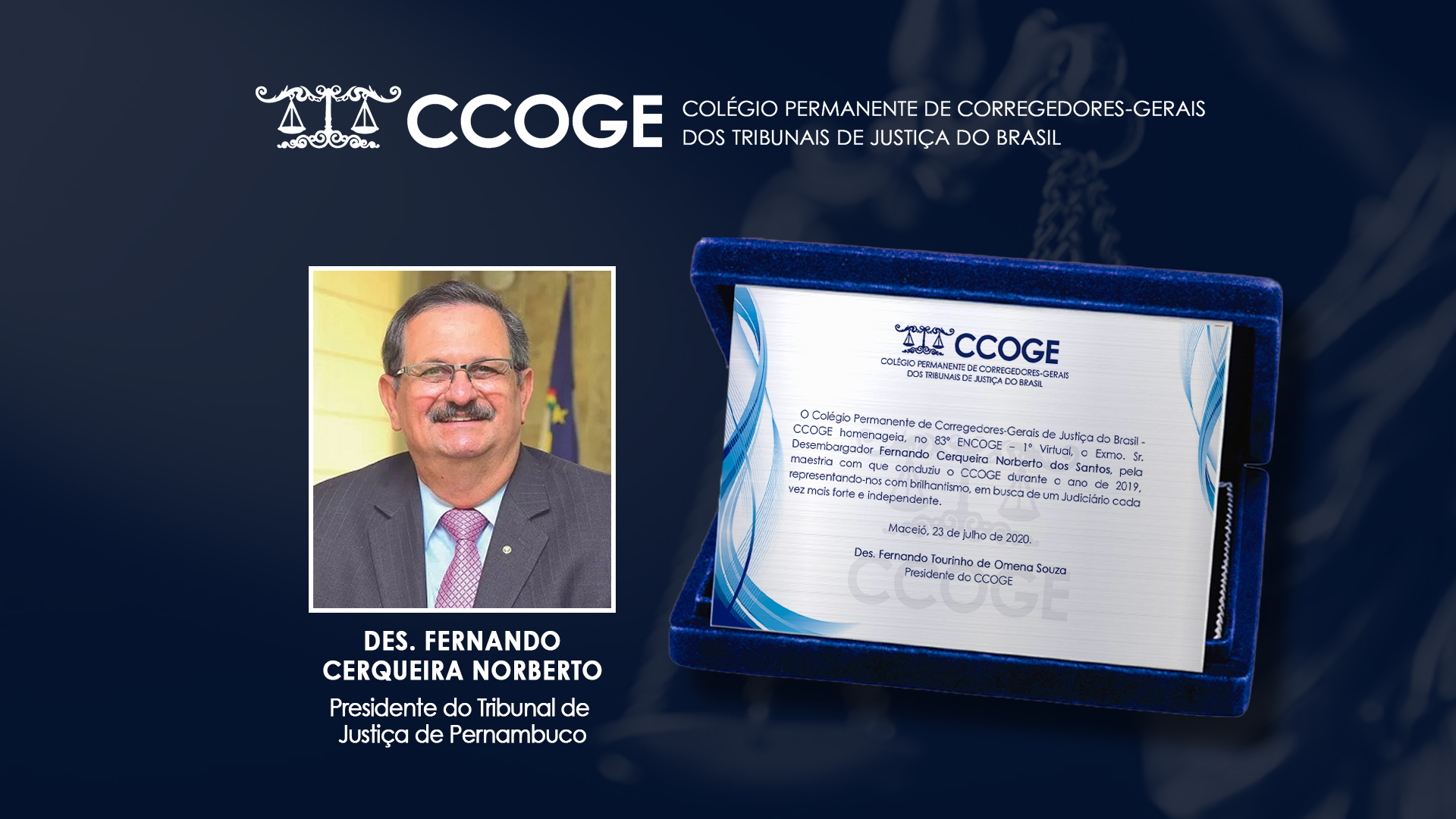 O Colégio de Corregedores também homenageou o ex-presidente do Encoge, desembargador Fernando Norberto, atual presidente do TJPE, além do ministro Humberto Martins, corregedor nacional de Justiça, que fez seu discurso de despedida, uma vez que vai ocupar a presidência do Superior Tribunal de Justiça (STJ).