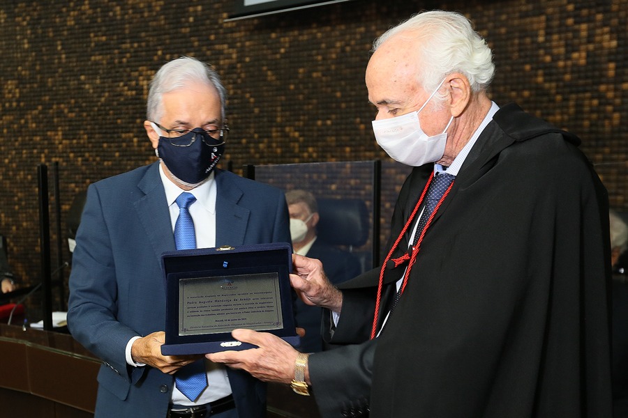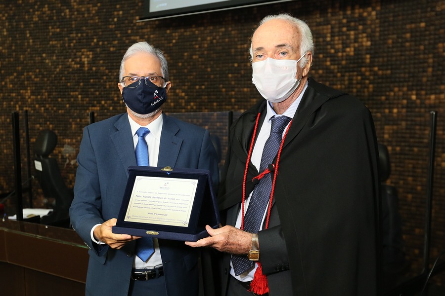 Pedro Augusto Mendonça recebeu placa de homenagem da Almagis, entregue pelo juiz Ricardo Jorge Cavalcante Lima. Foto: Caio Loureiro