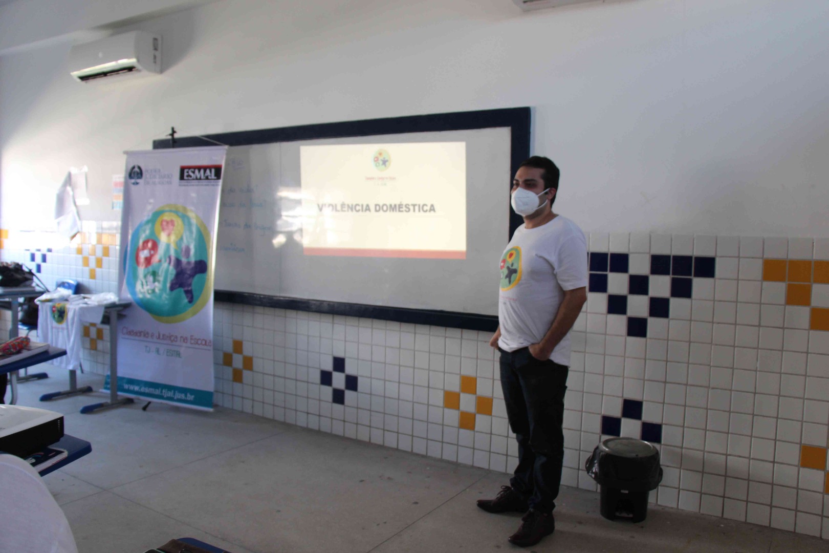 O servidor informou aos adolescentes que a Lei Maria da Penha abrange todas as mulheres e as protege perante a lei, não sendo necessário que a própria vítima denuncie situações de violência doméstica, qualquer pessoa pode fazer isso.