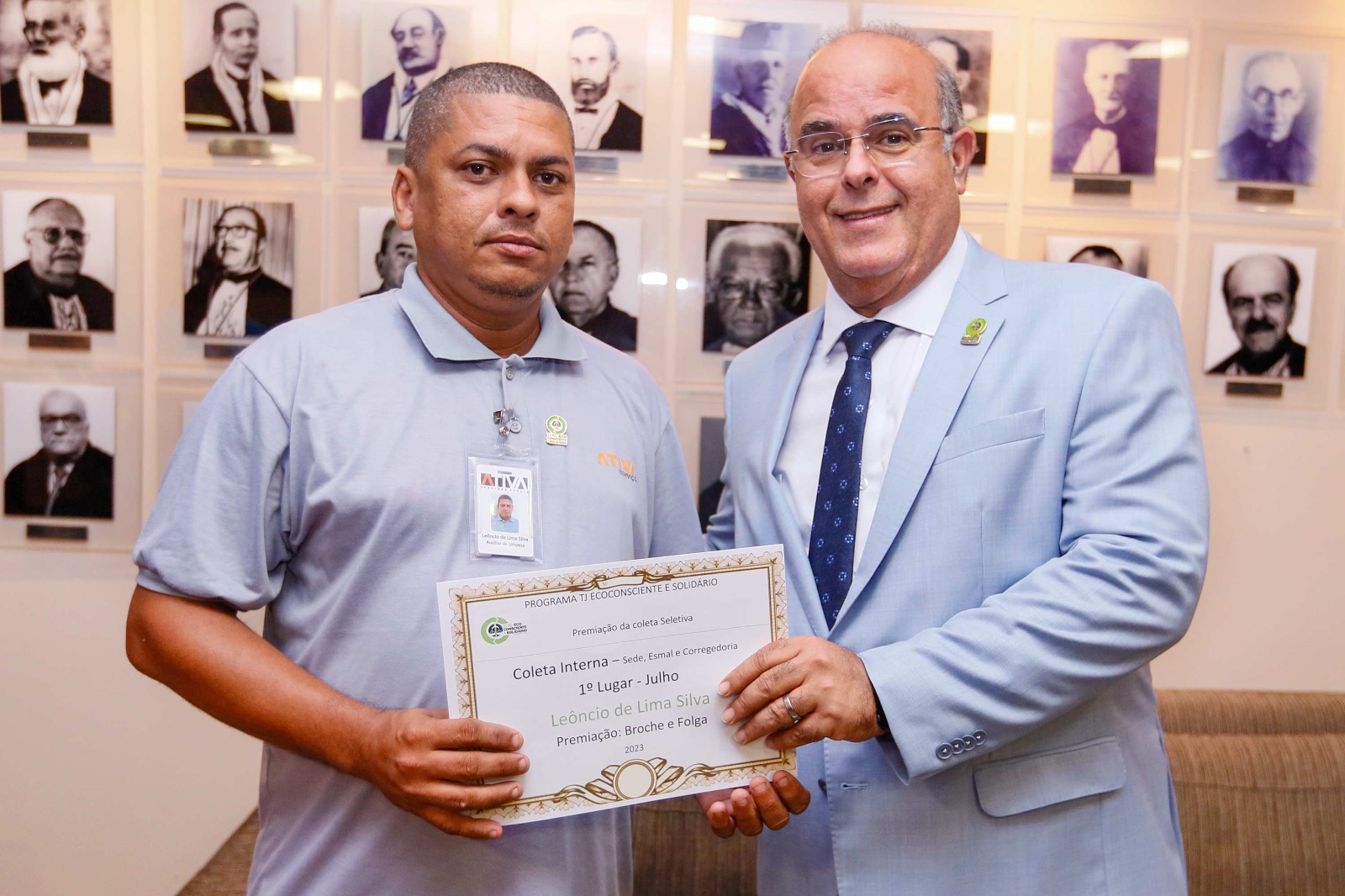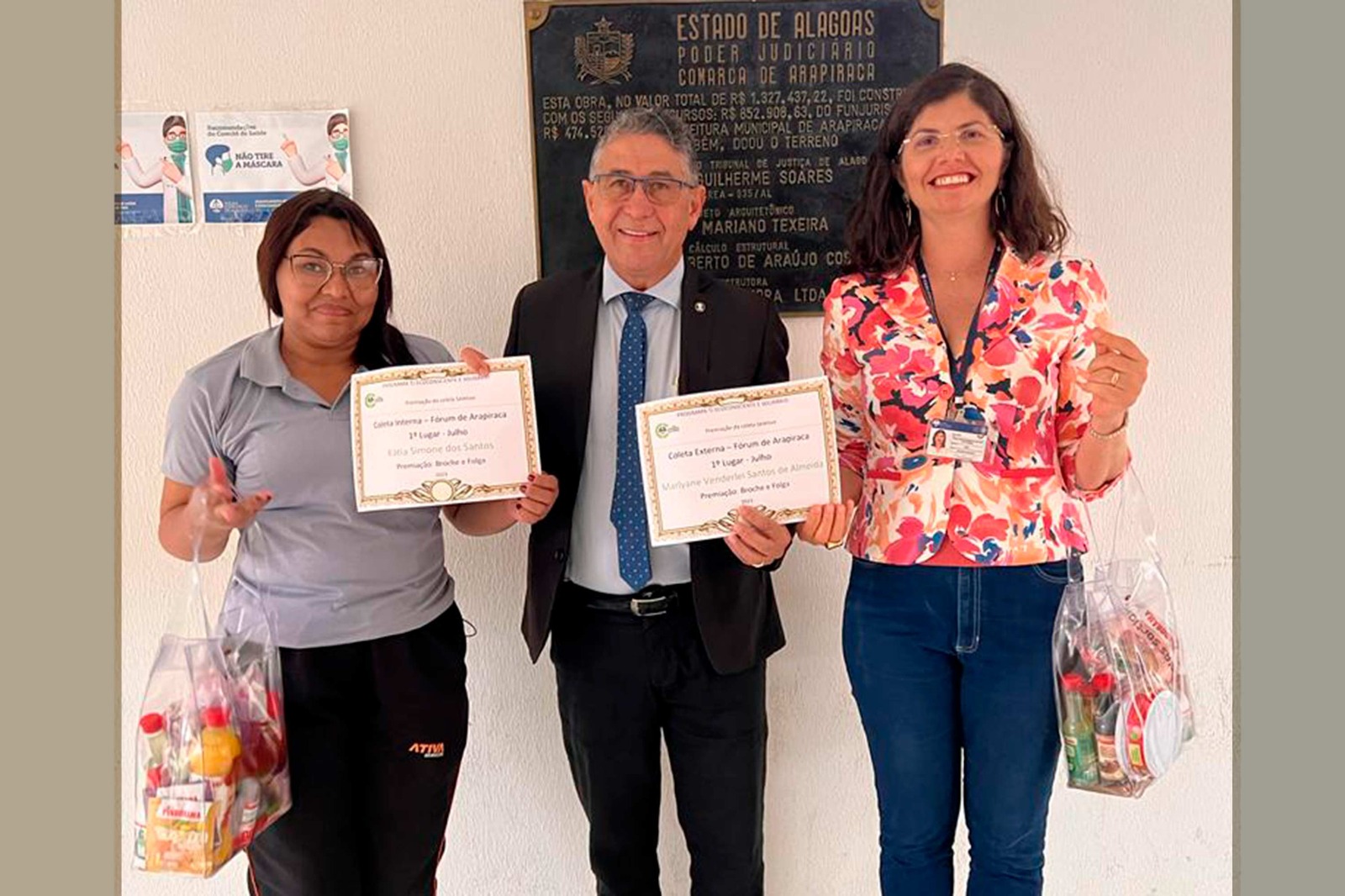 O presidente do Tribunal de Justiça de Alagoas (TJAL), desembargador Fernando Tourinho, premiou os servidores que mais contribuíram com a coleta seletiva no mês de julho. Os servidores Leôncio de Lima e Maria de Fátima, da empresa terceirizada Ativa, separaram os maiores volumes de material reciclado. A premiação aconteceu nesta terça (29), na presidência.