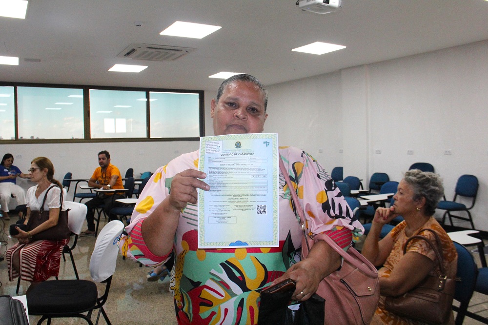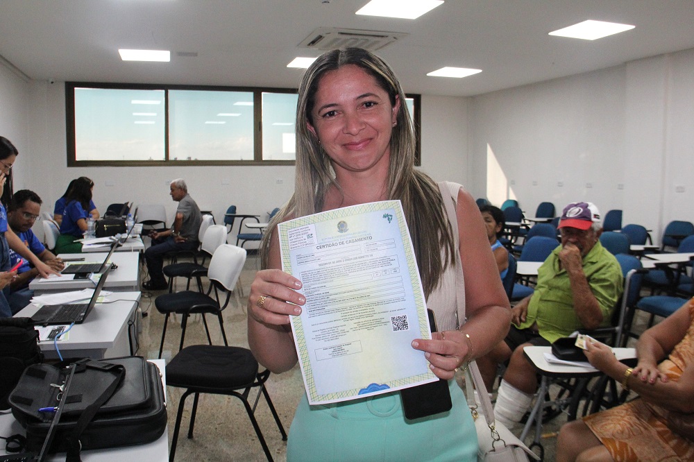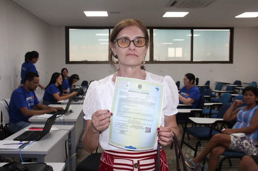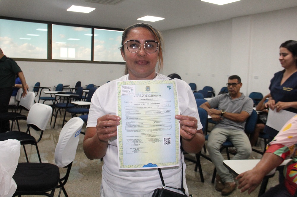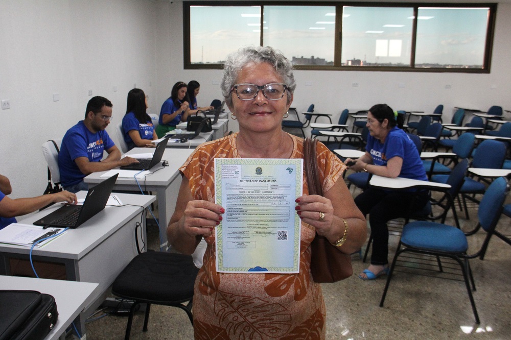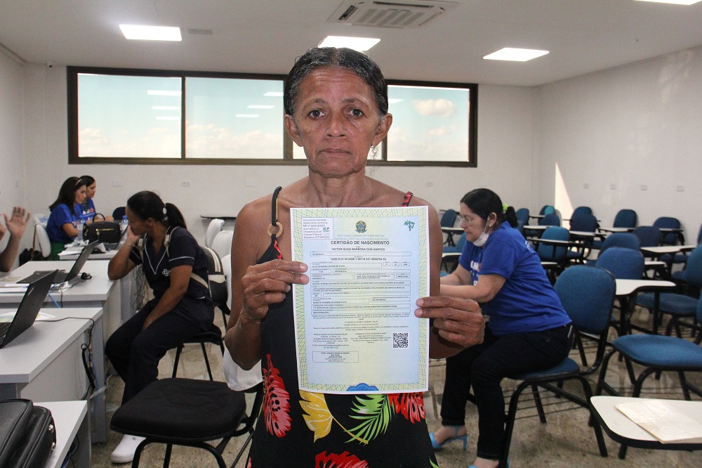 “Vim tirar meus documentos porque fui assaltada; entraram em minha casa e roubaram uma pasta que estava com toda minha documentação. Além da certidão de óbito do meu esposo, também vim pegar a certidão de casamento e aproveitei para fazer o registro do meu filho. Foi maravilhoso. Se for pra dar nota mil, foi mil”.