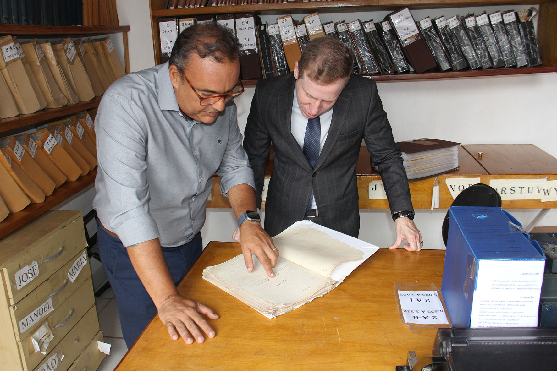 Tabelião Luiz Campos mostrou documentos históricos ao juiz Anderson Passos. Foto: Niel Rodrigues