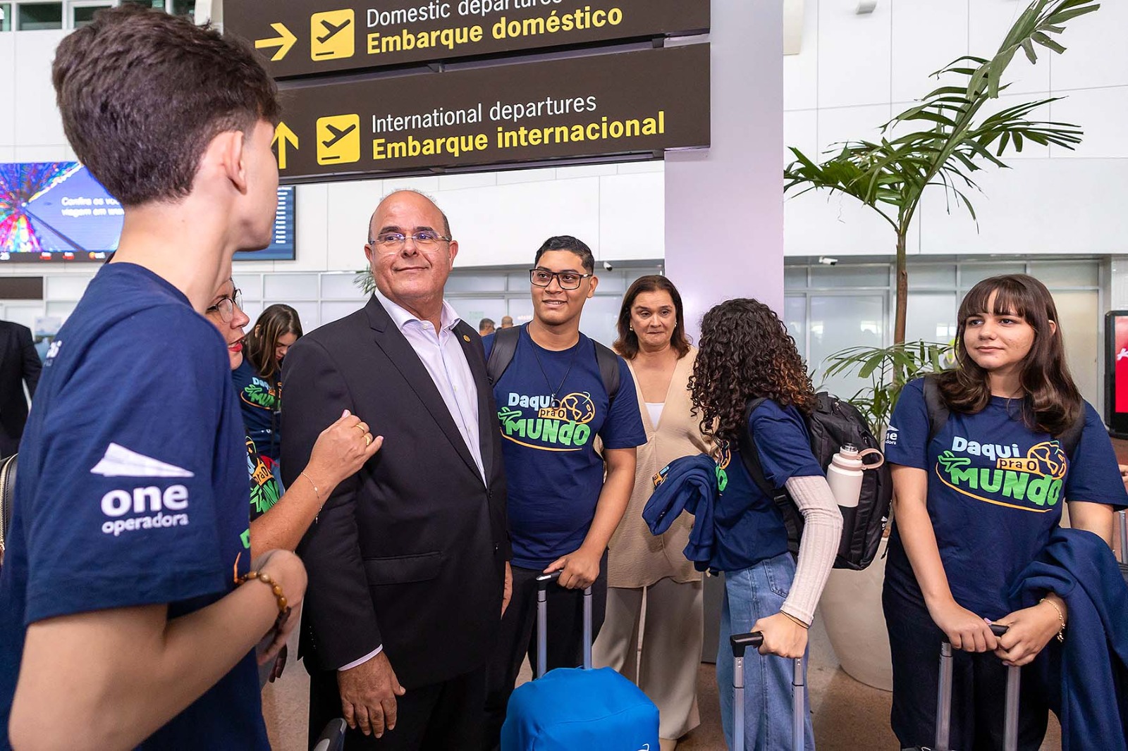 Fernando Tourinho esteve, na última quinta (16), no Aeroporto Internacional Zumbi dos Palmares para prestigiar o embarque de 50 estudantes da rede pública para Londres. Os alunos participam de um intercâmbio cultural através do programa estadual "Daqui pra o mundo". Enquanto acompanhava o embarque, ele conversou com estudantes, pais e monitores e destacou a relevância dessa experiência na formação acadêmica e pessoal dos jovens.