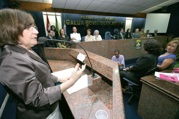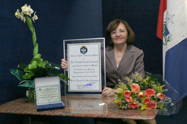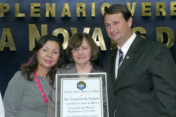 Depois de se emocionar muito com a exibição do vídeo, a Elisabeth Carvalho recebeu das mãos de Tereza Nelma o título de cidadã honorária de Maceió, concedido com base no Decreto Legislativo 443/2009. “Desde cedo, ainda menina, Elisabeth se interessou pela missão de levar mais Justiça ao povo”, afirmou a vereadora, que aproveitou para pedir à desembargadora a criação da Vara da Criança e do Adolescente.