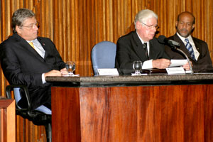 Desembargador Hollanda discursa na solenidade de instalação da 17ª Vara Criminal da Capital ao lado do governador Teotônio Vilela e do deputado estadual Alberto Sexta-feira.