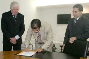 José Adelmo Rodrigues lendo termo de posse, ladeado pelo Presidente Hollanda e o diretor-geral do TJ/AL