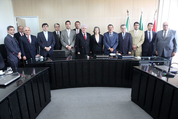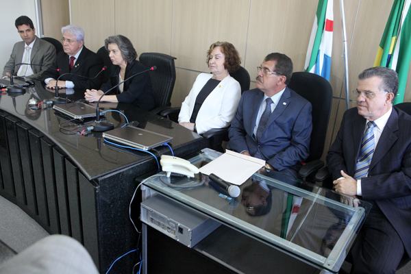 O ministro Humberto Martins, do Superior Tribunal de Justiça (STJ), o desembargadores José Carlos Malta Marques, presidente eleito do TJ para o biênio 2013/2014, e o desembargador Otávio Leão Praxedes, presidente da Câmara Criminal do TJ, também participaram da reunião com a ministra Carmen Lúcia, na sede do TRE, no centro de Maceió.