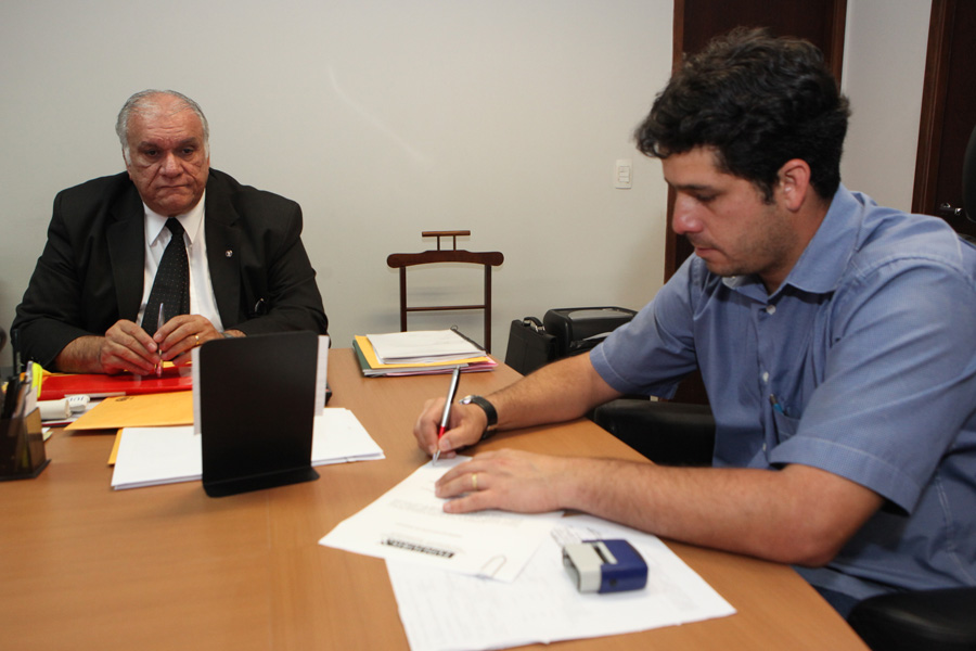 O magistrado Roldão Oliveira Neto, presidente da Comissão Gestora do Fundo de Modernização do Poder Judiciário (Funjuris), o chefe do departamento financeiro do Funjuris, Renato Barbosa, o engenheiro do Departamento Central de Engenharia e Arquitetura (DCEA) do Funjuris, André Luiz Lopes e o representante da empresa responsável pela entrega da obra, Cony Engenharia LTDA, Dartagnhar Apratto Torres também participaram da solenidade de assinatura do documento.