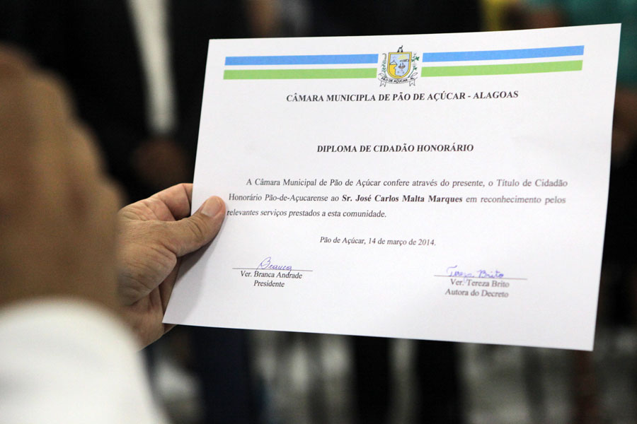 O secretário-chefe do Gabinete Civil do Estado de Alagoas, Álvaro Machado, participou da solenidade, representando o governador Teotônio Vilela. “Poucos amam tanto o Sertão quanto o presidente José Carlos Malta. Por isso sei que Pão de Açúcar presta essa homenagem com muita satisfação. Agora o senhor é um conterrâneo nosso e isso muito nos orgulha”, declarou o secretário, que nasceu naquela cidade.