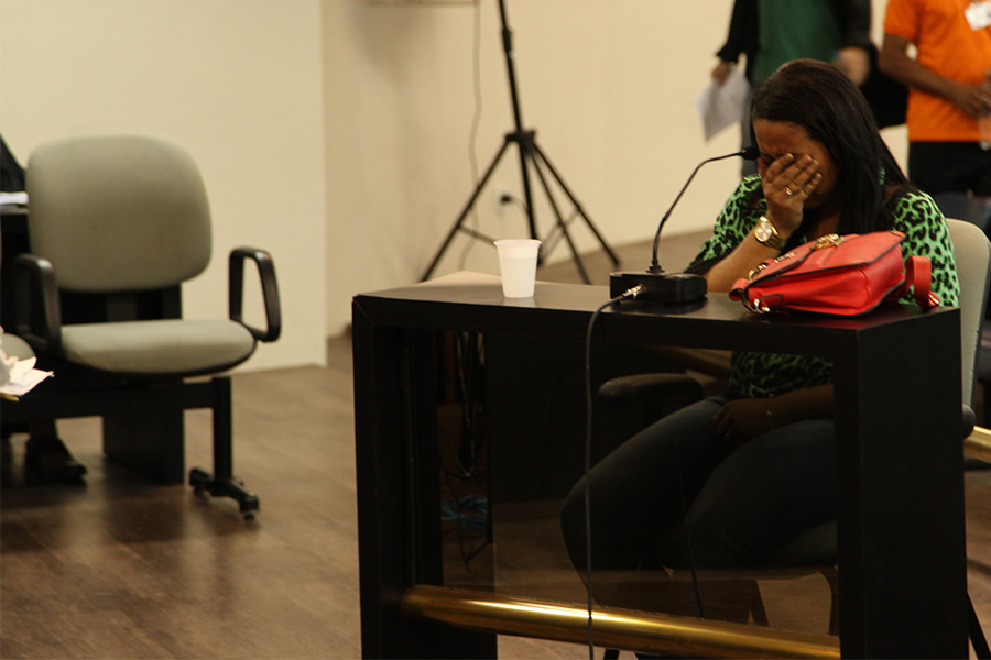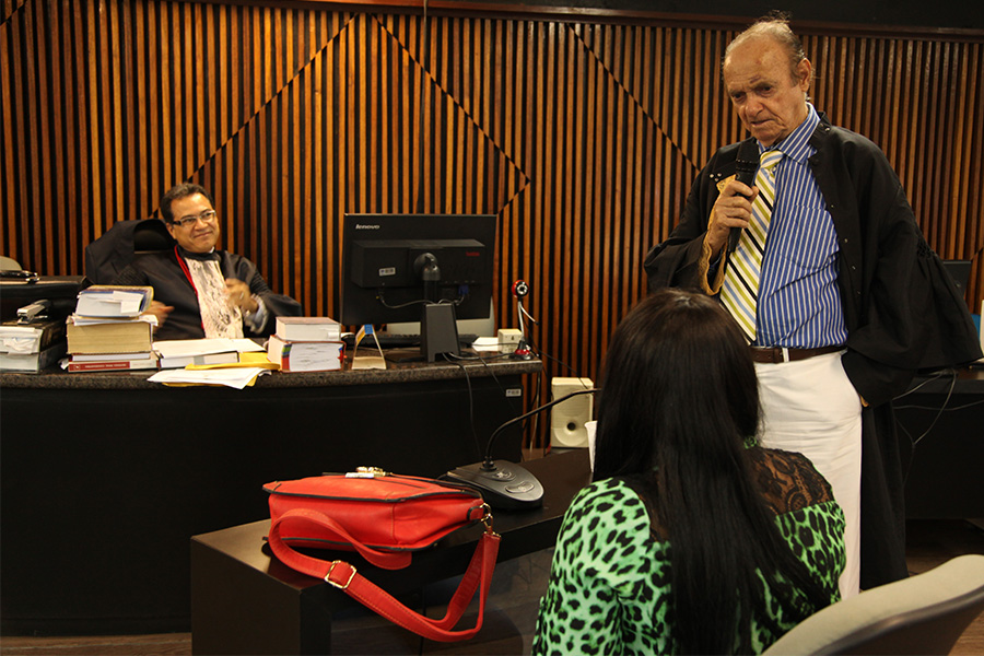 Magistrado Geraldo Amorim ouve depoimento da filha da vítima. Foto: Anderson Moreiro