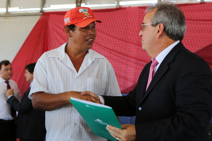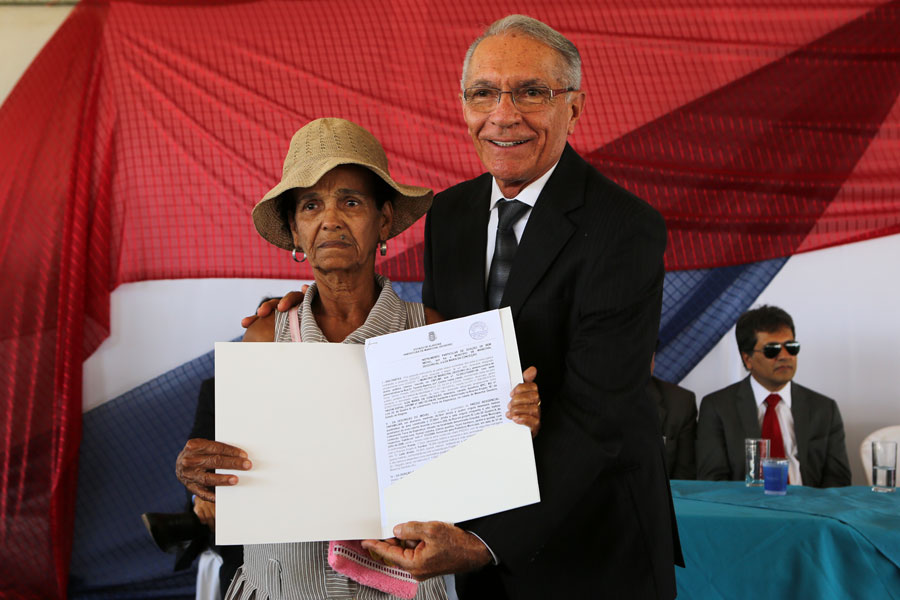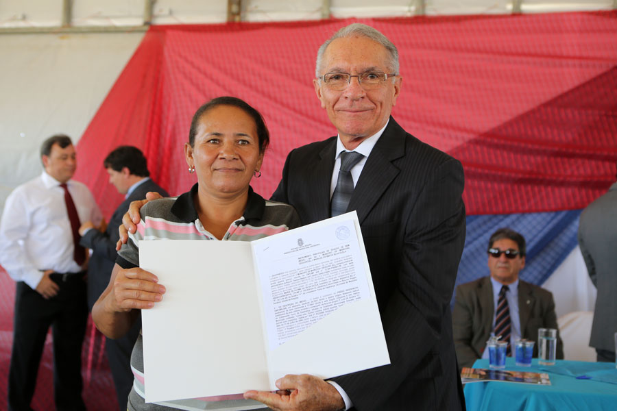 Washington Luiz entrega escritura para a moradora Maria dos Santos, que emocionou-se. (Foto: Caio Loureiro).
