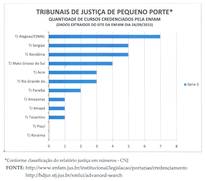 O levantamento também avalia o credenciamento de cursos pelos tribunais de Justiça de pequeno porte. Nesta colocação, a Escola da Magistratura de Alagoas volta a liderar o ranking que teve o Judiciário de Sergipe novamente na segunda posição, o de Rondônia na terceira e o do Mato Grosso do Sul na quarta.