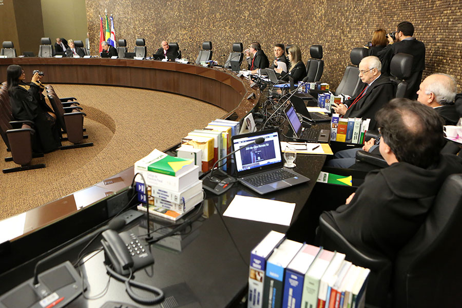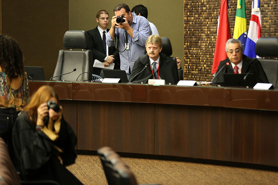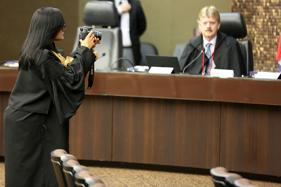 Aluna fotografa desembargador durante sessão do Pleno do TJ/AL. (Foto: Caio Loureiro)
