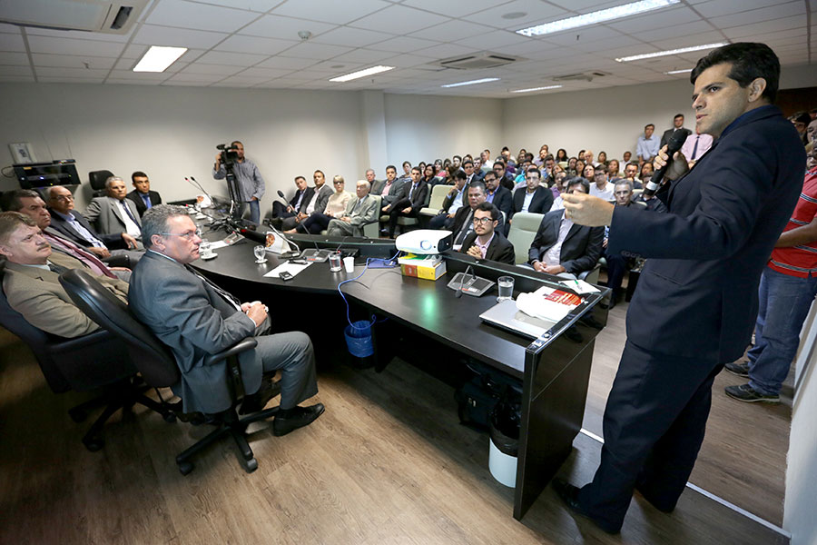 Webdesigner Fábio Maranhão apresenta novo portal em auditório no TJ. Foto: Caio Loureiro.