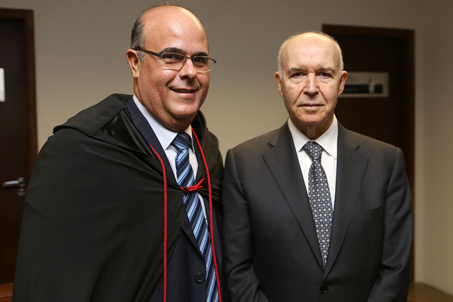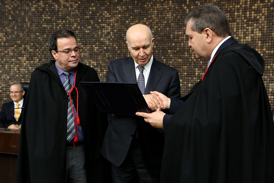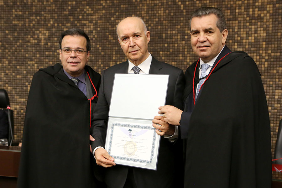 Desembargador Tutmés Airan e presidente Washington Luiz entregam diploma da Comenda a José Gomes Canotilho.